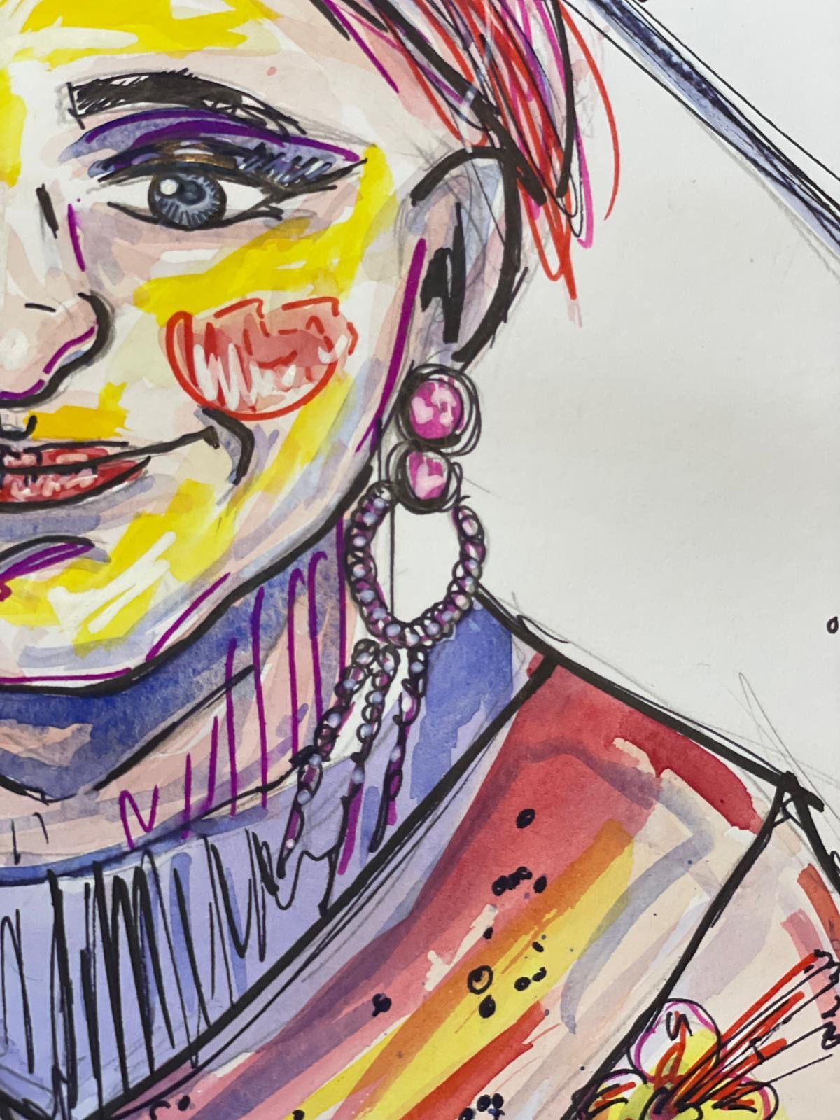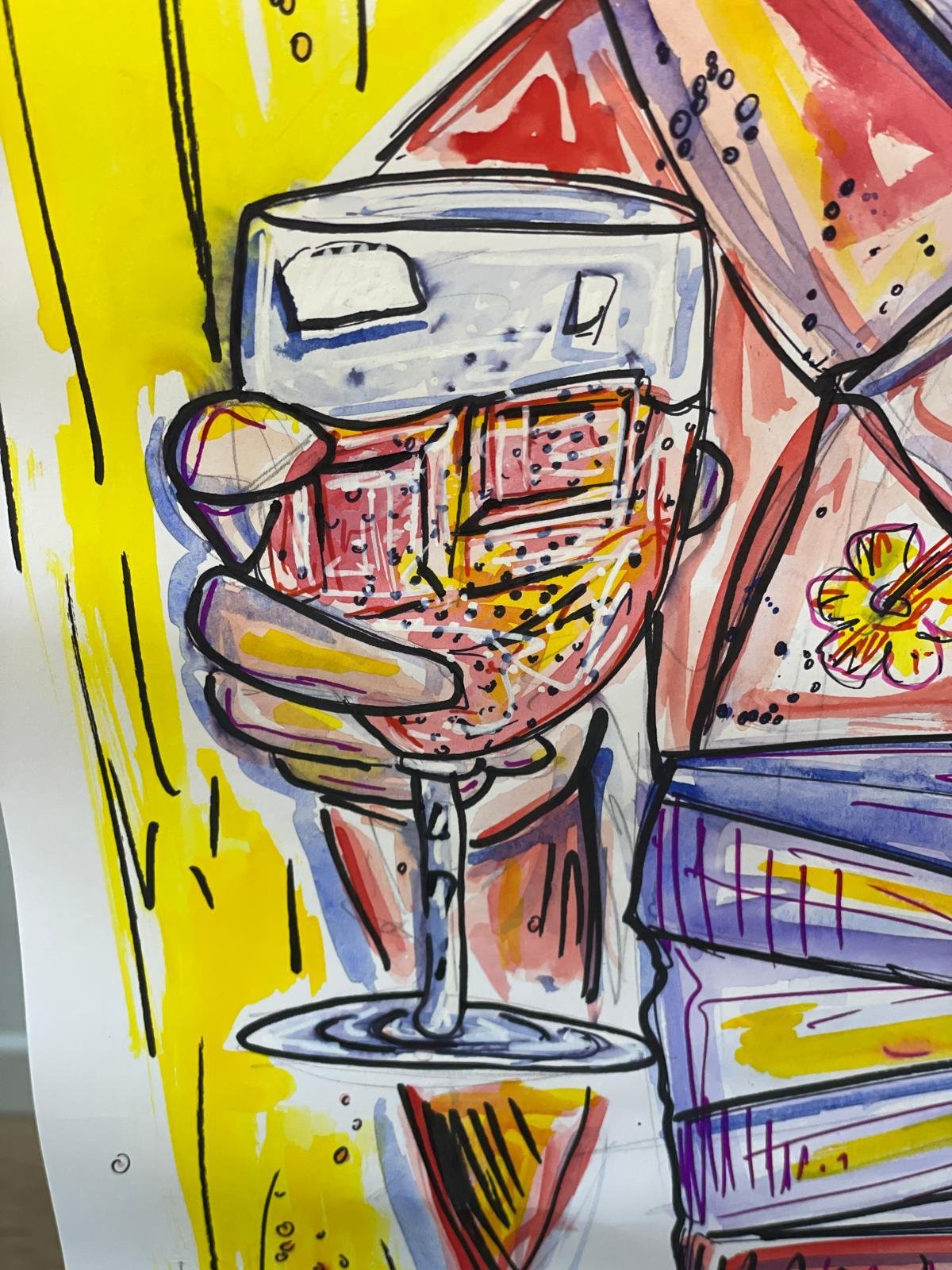 Fragments of Dew Portrait of a Geisha, depicted in the act of toasting. Watercolors and pantones on paper. Dimensions: 33×48. One-of-a-kind. Buy Now